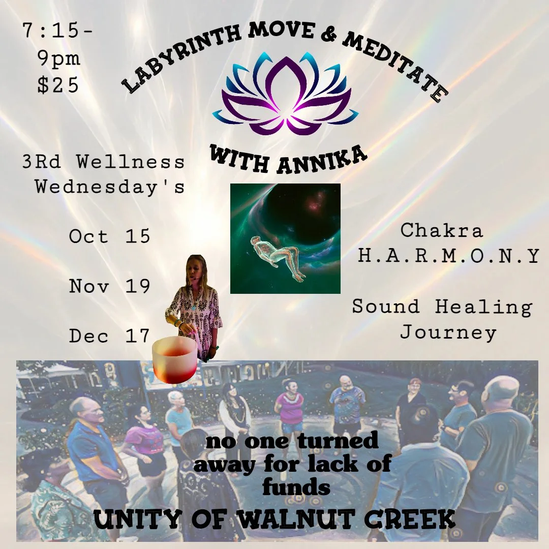 Please join me as we journey the Labyrinth, shake the Shakti, dance with our inner child, and harmonize our chakras this season of Samhain. The next three- third Wednesdays will be dedicated to softening into the season and planting seeds for the new self as we release what no longer serves us. You will learn the chakra pairs path to enlightenment via H.A.R.M.O.N.Y. A meditation system of sound and visualization created by yours truly!