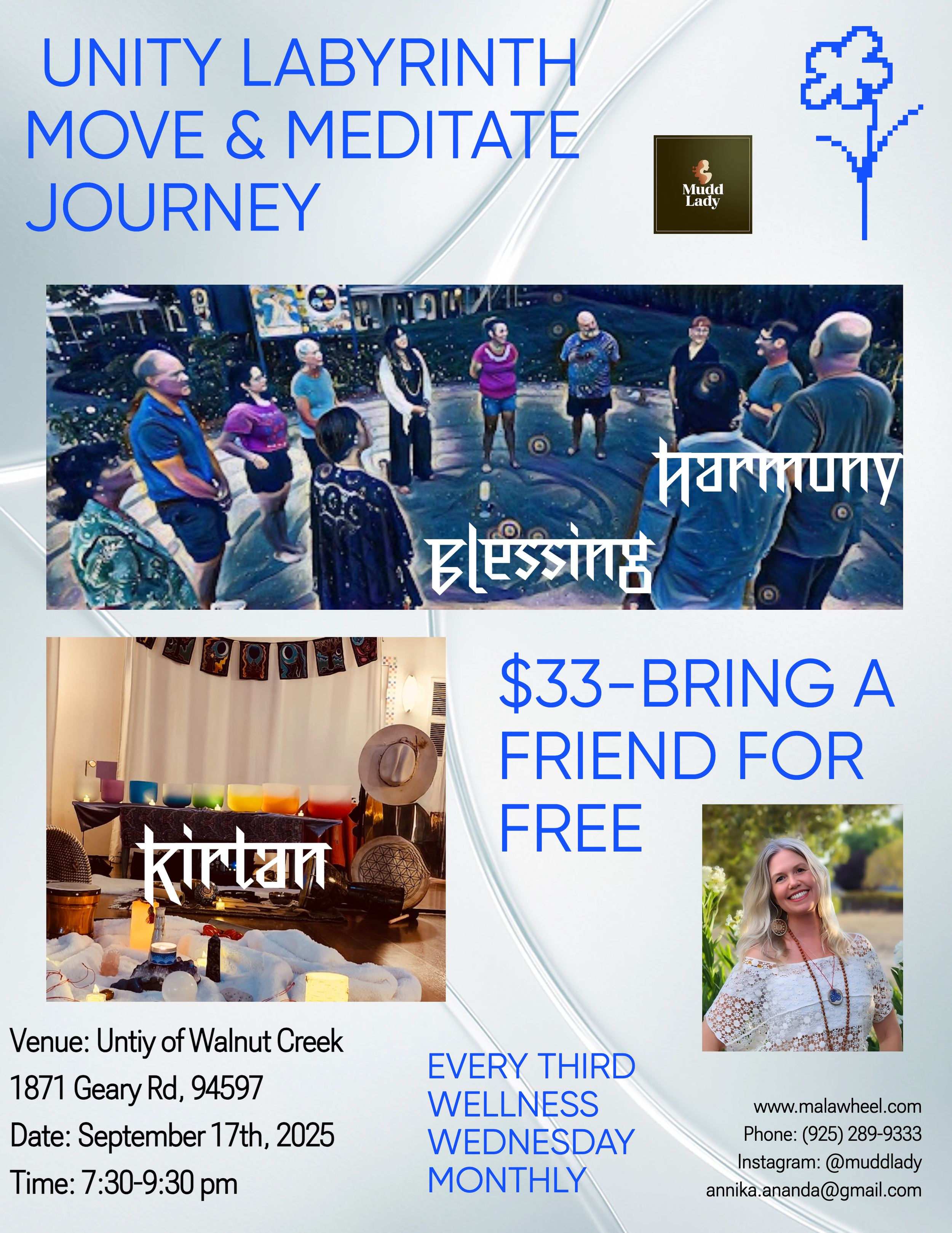 Now on Wellness third Wednesdays! Join us for a grounding evening on the Labyrinth, Shakti shake out and Chakra yoga on the lawn and in the community room for binary sound healing. 33 and bring a new friend for free!